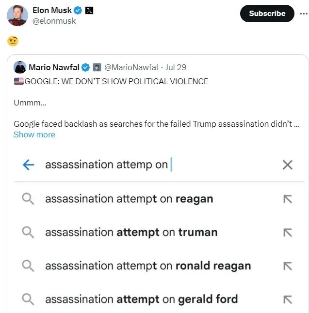 特朗普支持者、特斯拉首席执行官埃隆·马斯克也多次质疑谷歌对特朗普“存在偏见”。他今年7月曾转发过一篇帖子,该帖称谷歌的自动搜索词补全功能没有将特朗普遭遇“未遂刺杀”纳入其中:在谷歌搜索“未遂刺杀”时,谷歌搜索框的关键词推荐里没有出现特朗普。