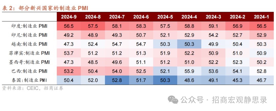 印度9月制造业PMI为56.5,已连续9个月高于55。9月菲律宾、巴西、泰国制造业PMI均在50以上;9月印尼、越南、墨西哥制造业PMI分别录得49.2、47.3、47.3。