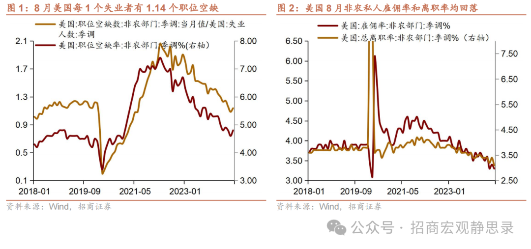 美国职位空缺边际提升。10月1日美国劳工统计局发布数据,8月职位空缺数804万人,高于预期的767.3万人,且前值从767.3万人上修至771万人。8月职位空缺率录得4.8%[1],每1个失业者有1.1个职位空缺。8月离职率降至1.9%,为除疫情外2015年以来的最低水平。