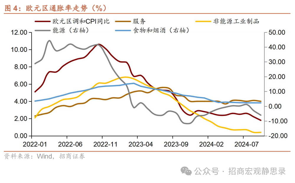欧元区9月CPI同比回落,核心CPI同比下降。10月1日欧盟统计局公布初步统计数据,欧元区9月调和CPI同比1.8%(预期1.8%,前值2.2%),环比-0.1%(预期0%,前值0.1%);9月核心调和CPI同比2.7%(预期2.7%,前值2.8%)。分项看,食品和烟酒同比2.4%(前值2.4%),能源项同比-6.0%(前值-3.0%),非能源工业商品同比0.4%(前值0.4%),服务项同比降温至4.0%(前值4.2%)。分国家看,德国、西班牙、意大利和法国9月CPI同比增速均下行。
