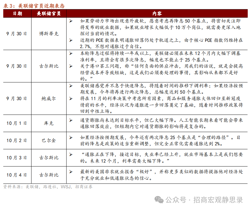 美国非农全面超预期打压降息预期。如前文所述,9月非农就业超预期大增25.4万人且前值上修,同时失业率下降至4.1%。芝加哥联储主席奥斯坦·古尔斯比随后在媒体上称此报告“非常棒”,并表示持续的劳动力市场强劲数据将增强对美国正迈向充分就业目标而非衰退的信心[2]。