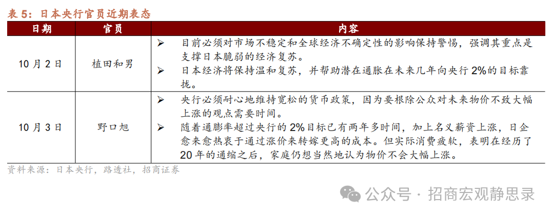 日本央行官员表态偏鸽。10月2日,日央行行长植田和男表示高度关注眼下事 态发展,“从美国经济开始,全球经济前景不确定且金融市场仍然不稳定,”,因而将仔细评估前景后再做决定。10月3日, 日本央行审议委员野口旭表示,日本央行必须耐心地维持宽松的货币政策,因为消除公众对未来物价不会大幅上涨的看法需要时间。
