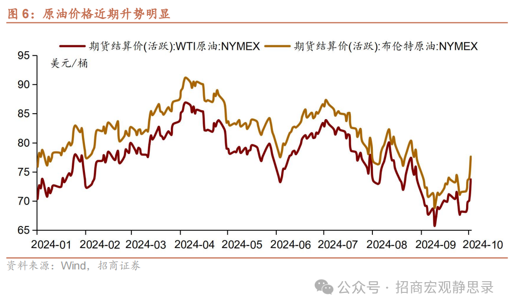 9 月 27 日,内塔尼亚胡在纽约联合国大会上发表激烈的演讲,称以色列在多个方面“获胜”[6],并将攻击伊朗及其在中东的代理人。内塔尼亚胡讲话结束后不久,以色列空袭袭击了贝鲁特南部[7]。9月28日,真主党发表声明证实其长期领导人哈桑·纳斯鲁拉的死讯[8]。9月30日,真主党副领导人纳伊姆·卡西姆在纳斯鲁拉死后首次公开发表讲话时表示,“抵抗力量已经做好了地面交战的准备”[9]。10月1日,以色列地面部队进入黎巴嫩南部,以色列军方表示已开始对黎巴嫩南部的真主党目标进行“有限的、局部的和有针对性的地面袭击”[10]。同日,伊朗向以色列发射了至少 180 枚导弹,并称此次炮击是对以色列最近几周对伊朗支持的黎巴嫩真主党武装组织发动一系列毁灭性打击的报复。10 月 4 日,以色列隔夜袭击了黎巴嫩真主党的情报总部,随后,伊朗领导人哈梅内伊表示伊朗及其地区盟友不会退缩,且“不会拖延或仓促履行其与以色列对抗的义务”[11]。受中东紧张局势升级影响,油价迅速回升。10月1日WTI原油上涨 2.44%,收于每桶 69.83 美元。10月3日,拜登表示,国正在与以色列讨论以色列袭击伊朗石油基础设施的可能性[12], WTI原油上涨5.15%。