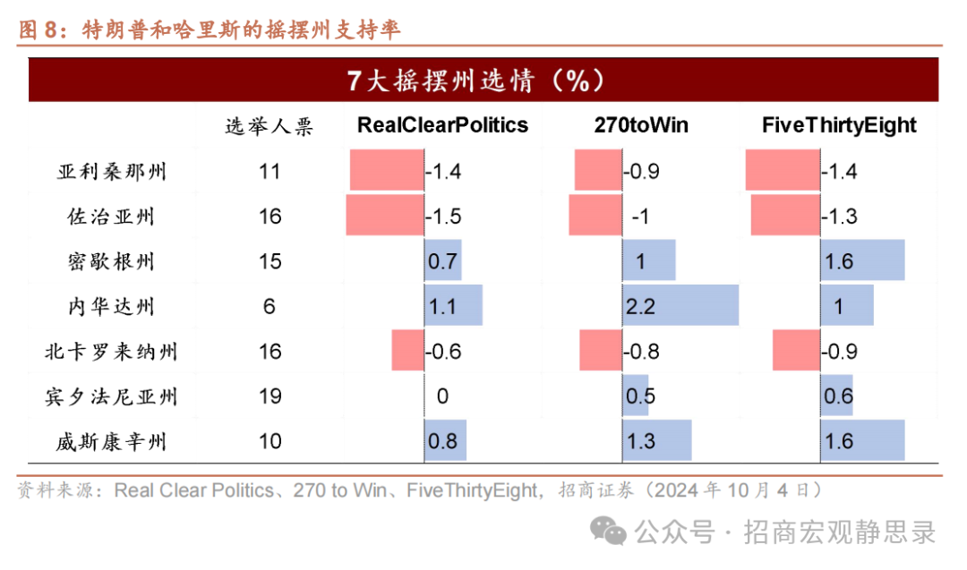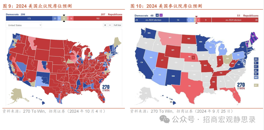 今年7-8月特朗普相对哈里斯支持率逐步缩小乃至逆转,9月10日大选辩论后,哈里斯的领先优势扩大。根据Real Clear Politics民意调查,截至10月3日,特朗普和哈里斯平均支持率为46.9%和49.1%,哈里斯领先2.2个百分点。7个摇摆州的民意调查也对哈里斯有利,截至10月4日,FiveThirtyEight和270 to Win一致显示,哈里斯在摇摆州相对特朗普均有领先优势。国会方面,共和党仍然存在较大优势,根据270 To Win最新预测,众议院中共和党预计占207席、民主党占206席;参议院中共和党预计占51席、民主党占48席。