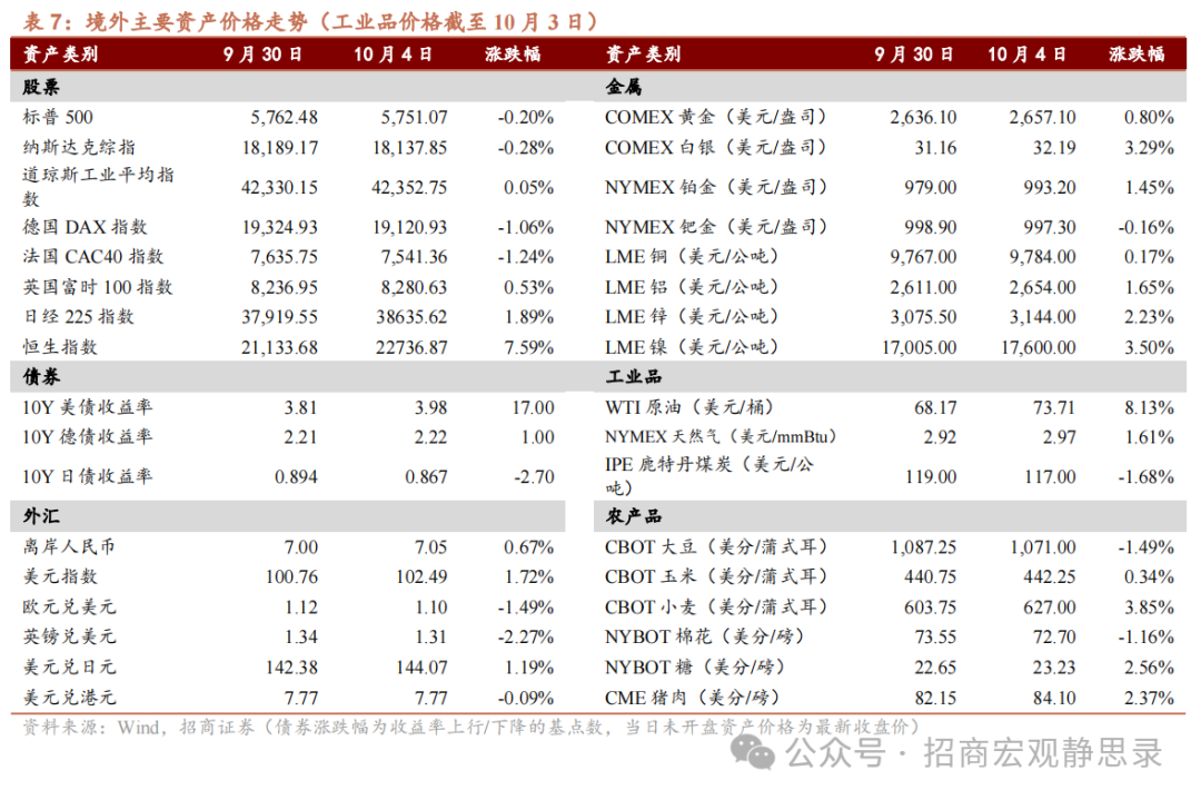 时政要闻:1)中东局势急转直下提振油价。9月27日至10月4日,黎以冲突愈演愈烈,地缘因素推动油价大幅反弹。2)石破茂接任日本首相。9 月 27日石破茂在自民党总裁选举中以决定性一票击败高市早苗,并于10 月 1日当选为日本第 102 任首相。上任后其向外界展示不会干预央行政策,并强调首要经济任务是战胜通缩,使国家进入稳定的增长轨道。3)美国大选跟踪:哈里斯支持率略高于特朗普,但副总统辩论中万斯表现更佳。9月10日大选辩论后,哈里斯的领先优势扩大。10月1日副总统辩论焦点主要集中于堕胎、移民及中东等事务,而总统辩论时交锋激烈的俄乌问题则未被纳入此次辩论范畴。整体来看,副总统辩论对各自总统候选人选情提振效果有限,但万斯表现更佳。4)美国东海岸和墨西哥湾沿岸的码头工人罢工,达成临时协议上调时薪62%。10月1日美国东海岸和墨西哥湾沿岸的码头工人开始近 50 年来的首次大规模罢工,10月3日码头工人与港口运营商宣布达成了一项临时性协议。5)欧盟通过对华电动车关税提案。10月4日,欧盟委员会提出的对从中国进口的纯电动汽车征收最终反补贴税的提议通过。其中,德国匈牙利等5国投了反对票。