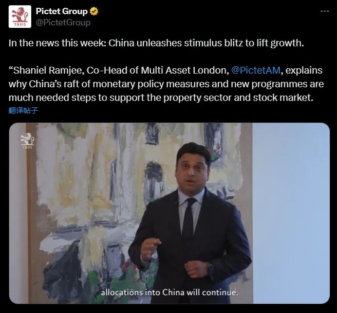 非常凑巧的是,百达官方社交媒体也在10月3日当天发布了一条解读。该公司的伦敦跨资产联席主管Shaniel Ramjee在短视频中表示,如果中国的“组合拳”政策标志着企业利润的转折点,那么对中国资产的加仓还会持续。