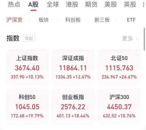导读节后首日,A股三大指数大幅高开。10月8日,上证指数涨10.13%,报3674.4点;深证成指涨12.67%,报11864.11点;创业板指涨18.44%,报2576.22点。超过5200只股票竞价阶......