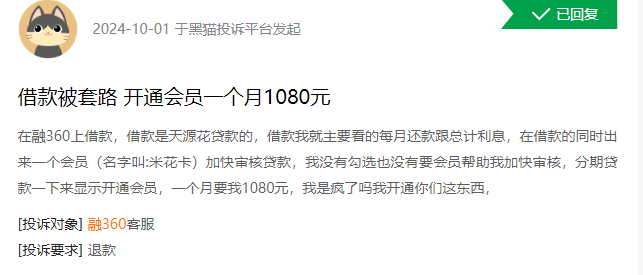 另有用户投诉称,在用户未开通会员的情况下,实际还款过程却产生每月高达1080元的会员费。
