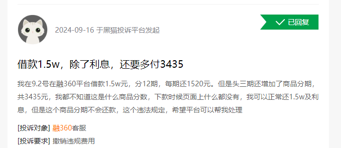 三是以各种名目变相收费,有用户投诉称,在融360借款1.5万元每月还款1520元,但在自己并不知情的情况下,前三期却累计产生3435元的商品分期费用。