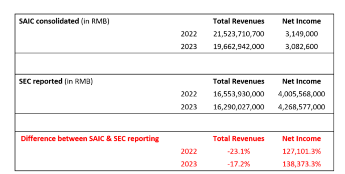 2023年公司向国家工商总局申报的净利润,与财报披露的净利润,分别为308万元和43亿元,两者相差1384倍。即使会计处理方式不同,但仍无法掩盖如此大的利润差异。