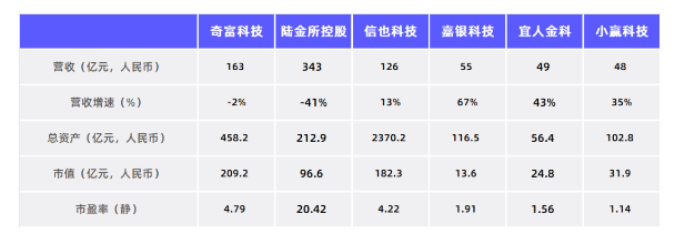2023年,包括奇富科技、陆金所控股、信也科技、嘉银科技、宜人金科、小赢科技在内的6家企业市值普遍低于总资产,甚至陆金所、嘉银科技等企业的市值更是低于营收,宜人金科、小赢科技的PE更是不足2倍。