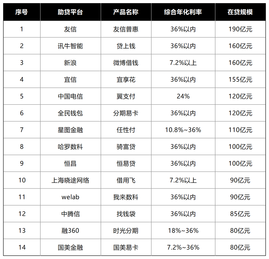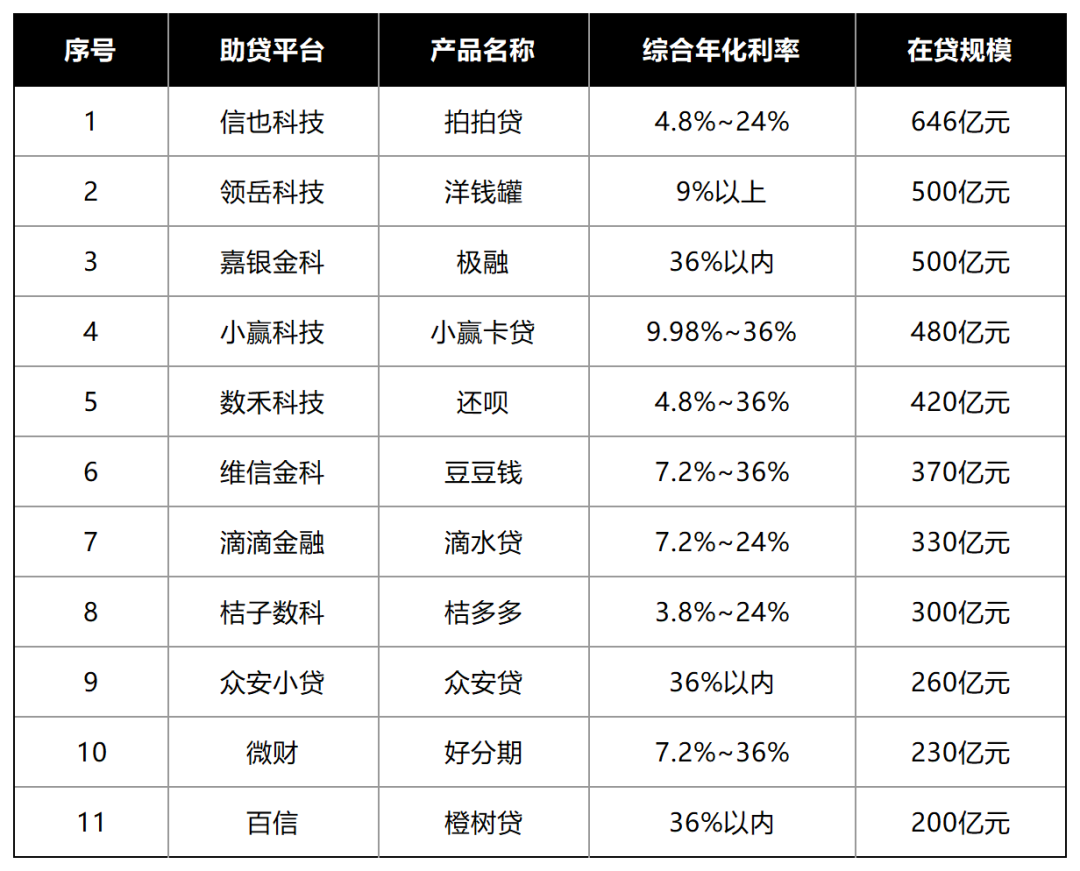 以信也科技、瓴岳科技为代表的平台处在行业第二梯队,区间行业TOP3规模占区间全部的63.3%。以友信、快牛智能、融360为代表的平台处在行业第三梯队,区间的行业TOP3规模占区间全部的24%,寡头垄断的趋势并不明显,竞争也是最为充分。