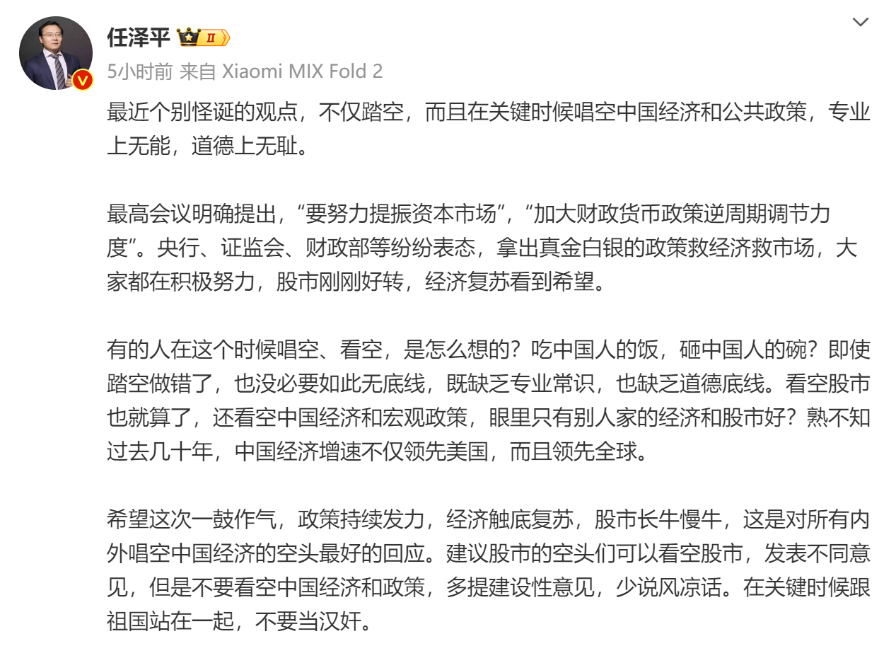 任泽平则回怼称,“最近个别怪诞的观点,不仅踏空,而且在关键时候唱空中国经济和公共政策,专业上无能,道德上无耻。”他分析称,最高会议明确提出“要努力提振资本市场”,“加大财政货币政策逆周期调节力度”。央行、证监会、财政部等纷纷表态,拿出真金白银的政策救经济救市场,大家都在积极努力,股市刚刚好转,经济复苏看到希望。