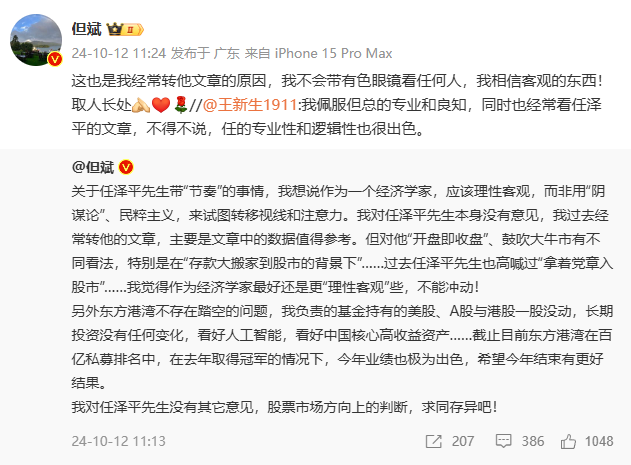 随着A股的大跌,10月11日两人的互怼升级。但斌发文要求任泽平道歉,称“喊大牛市,让股民往里冲的‘专家’和‘学者’还有一些自媒体作者,是否应该出来道个歉?!当然,我知道绝大多数这些人还是会‘嘴强牙硬’,有的把说过的话,发的帖子一删了事,仿佛什么都没有发生一样……最苦的恐怕是把存款从银行转出来买股票的‘投资小白’……”