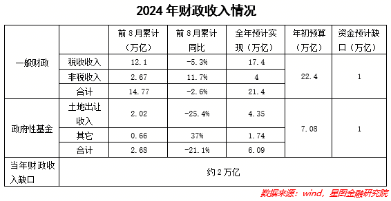 我们做一个假设,即全年的财政收入增速与前8个月累计情况基本一致,那么以目前的增速计算剩余的4个月财政收入,可以估计出全年财政收入约为21.4万亿元,同理推算政府性基金收入约为6万亿左右。两本账合计起来,与3月份两会公布的全年财政收入预算差距至少为2万亿元。