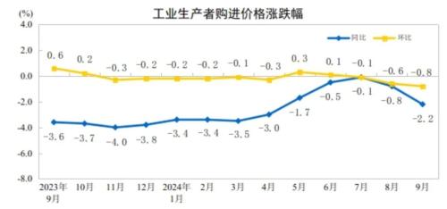 2024年9月份,全国工业生产者出厂价格同比下降2.8%,环比下降0.6%;工业生产者购进价格同比下降2.2%,环比下降0.8%。1—9月平均,工业生产者出厂价格比上年同期下降2.0%,工业生产者购进价格下降2.1%。