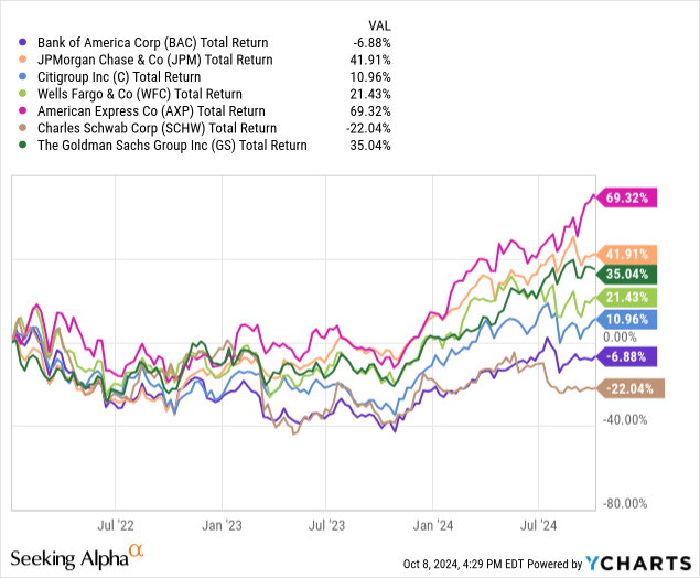 此外,自2022年1月达到顶峰以来,美国银行一直落后于美国的货币中心银行、按贷款规模排名的顶级贷方以及最大的经纪股票公司,如下图所示。分析师的排序列表包括摩根大通、花旗集团、富国银行、美国运通、嘉信理财和高盛。