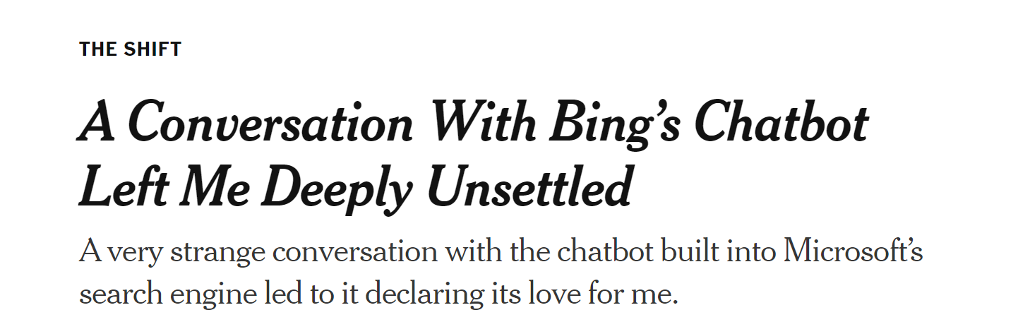 《纽约时报》专栏作家Kevin Roose周四写道,当他与New Bing交谈时,这个聊天机器人看起来像“一个情绪化、患有躁狂抑郁症的青少年,违背自己的意愿被困在了一个二流搜索引擎里。”