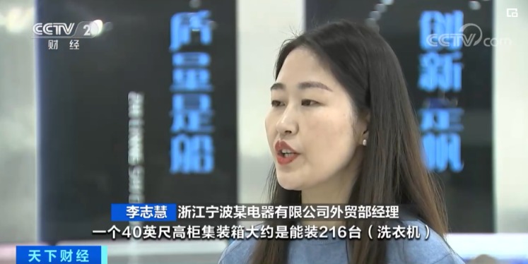 浙江宁波某电器有限公司外贸部经理李志慧:一个40英尺集装箱大约能装216台洗衣机。去年3月,海运费的最高点在18500美元左右一个标准集装箱,分摊到一台洗衣机大约在85美元左右。今年2月,海运费在4500美元,这样分摊在一台产品上,大约是20美元一台。