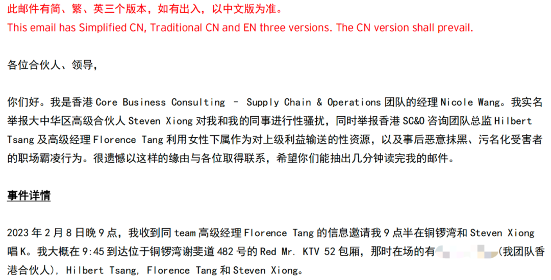 根据券商中国记者获得的举报信原文,一名自称是香港Core Business Consulting-Supply Chain & Operations团队(简称“香港SC&O团队”)的经理实名举报称,在2月8日的一次同事聚会中,大中华区高级合伙人Steven Xiong(熊某)对她及另一名女同事进行了性骚扰,包括不恰当的语言骚扰以及肢体接触。