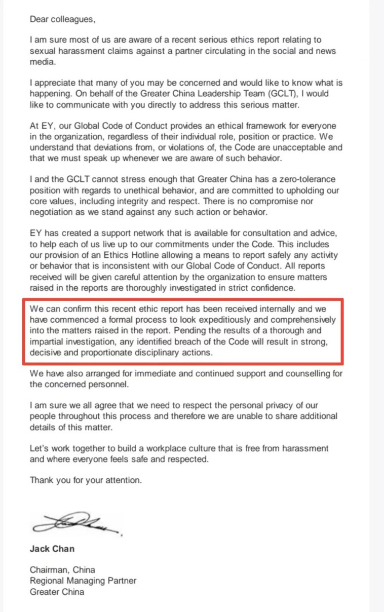 随着该事件迅速发酵,2月18日晚间,有媒体曝光了一封署名为安永中国主席、大中华区首席执行官Jack Chan的内部信。信中提到,安永已针对上述事件启动调查程序,为有关人员提供了即时、持续的支援,并强调“最终发现的任何违规行为,都将受到与之相称的严厉处罚”。