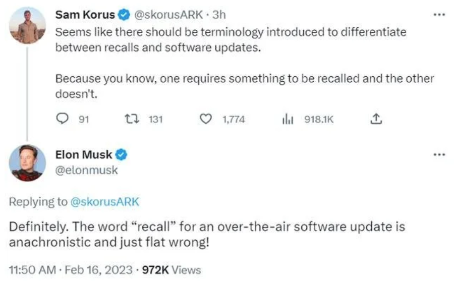 针对此事,特斯拉CEO埃隆·马斯克在社交媒体上回应,称美国国家公路交通安全管理局使用“召回”一词“错得离谱”,而他已经不是第一次这样吐槽。