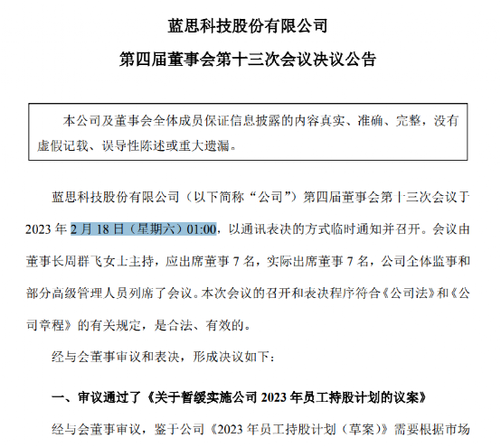不过,2月18日(星期六)凌晨1点,蓝思科技以通讯表决的方式,连夜临时通知召开董事会,表示鉴于公司《2023年员工持股计划(草案)》需要根据市场环境等新的情况进行调整和优化,同意暂缓实施2023年员工持股计划,待相关条件成熟后再重新启动。