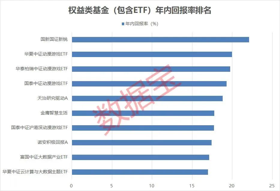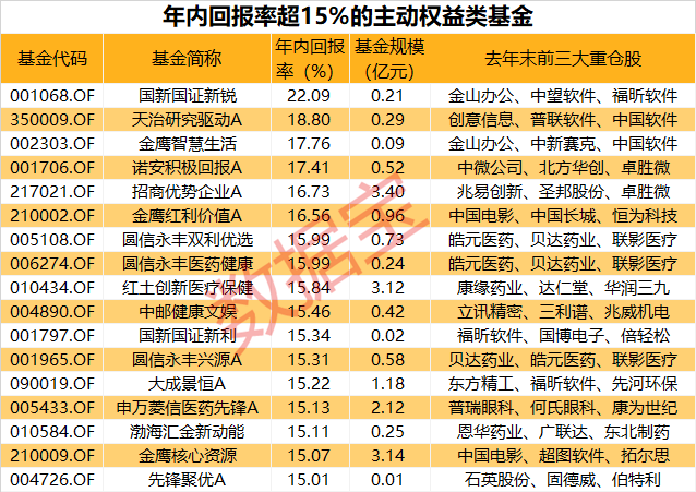 17只年内回报率超过15%的主动权益类基金分布在多个赛道,包括计算机、医药、新能源、文娱等主题。