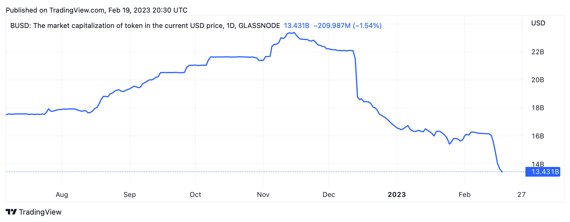 在 Paxos 宣布这一消息后,赎回开始加速,8 小时内赎回了 2.9 亿美元。公告发布时,流通中的 BUSD 为 161 亿美元。截至2023年2月19日,流通中的BUSD约为13,238,824,118个,这意味着BUSD赎回的17.77%占28.61亿个代币退出市场。