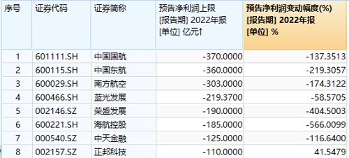 从预亏金额来看,11家公司预计亏损超10亿元。其中,中国国航、中国东航、南方航空、蓝光发展、荣盛发展、海航控股、中天金融、正邦科技等8家公司在2022年净利润预计亏损将超过百亿元。