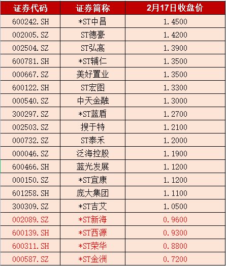 值得关注的是,截至17日收盘,A股共有52家公司股票价格不足2元/股。其中,19家公司股票股价在1.5元以下,*ST新海、*ST西源、*ST荣华、*ST金洲等四家公司股价已不足1元。