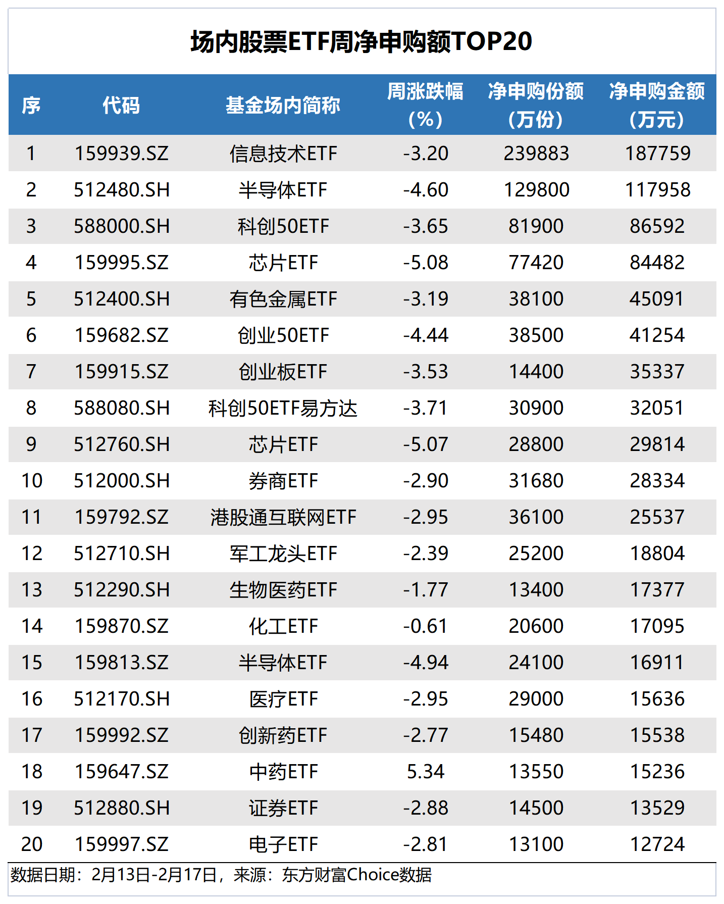 上周净申购金额最多的为信息技术ETF,净申购金额18.78亿元。此外,半导体ETF和科创50ETF也获申购居前,净申购金额依次为11.8亿元和8.66亿元。