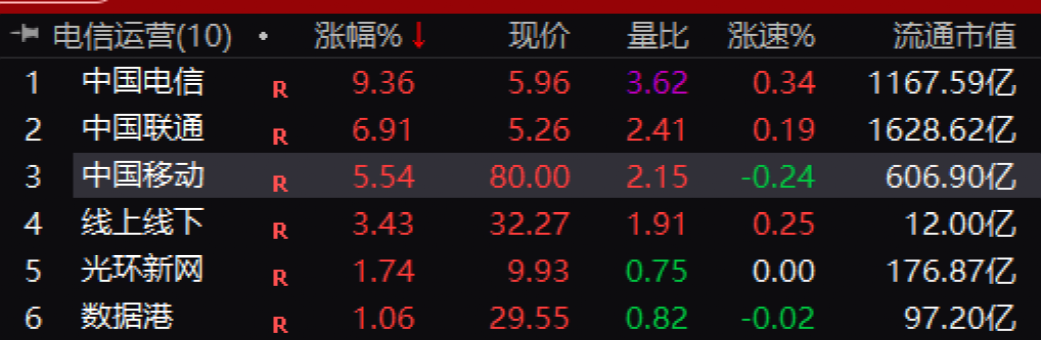 经营业绩稳健,持续受机构追捧的电信运营股再度拉升。中国电信大涨超9%,中国联通涨近7%,中国移动也涨超5%。