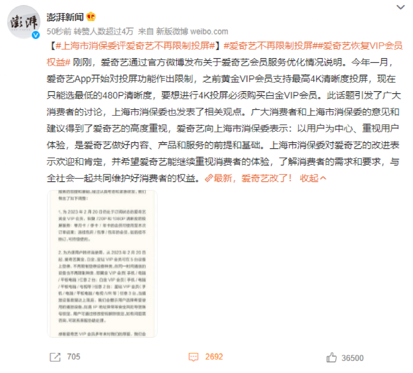 爱奇艺通过官方微博发布关于爱奇艺会员服务优化情况说明。今年一月,爱奇艺App开始对投屏功能作出限制,之前黄金VIP会员支持最高4K清晰度投屏,现在只能选最低的480P清晰度,要想进行4K投屏必须购买白金VIP会员。此话题引发了广大消费者的讨论,上海市消保委也发表了相关观点。广大消费者和上海市消保委的意见和建议得到了爱奇艺的高度重视,爱奇艺向上海市消保委表示:以用户为中心、重视用户体验,是爱奇艺做好内容、产品和服务的前提和基础。上海市消保委对爱奇艺的改进表示欢迎和肯定,并希望爱奇艺能继续重视消费者的体验,了解消费者的需求和要求,与全社会一起共同维护好消费者的权益。