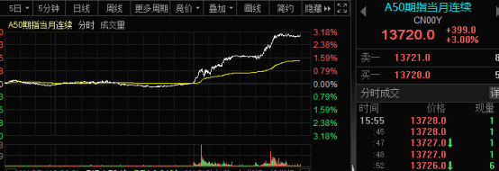 一是内因方面,经济复苏的信号非常强烈。而全面注册制出台之后,市场的交易规则偏向蓝筹,券商也受益,因此今天A50直接拉涨3%。