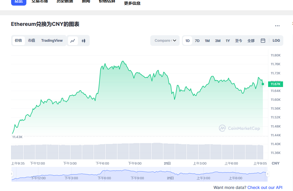 Ethereum 今日价格 为 ¥11,675.60 CNY,其 24 小时的交易量为 ¥50,569,217,405 CNY。 我们会实时更新ETH兑换为CNY的价格。 Ethereum 在过去 24 小时内增长了 2.47。 目前的 CoinMarketCap 排名为第 #2 位,其市值为 ¥1,428,788,838,860 CNY。 其流通供给量为 122,373,866 ETH 个货币 目前无法提供供给量上限信息。