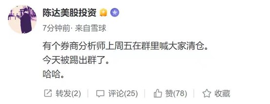 有大v在社交媒体调侃“有券商分析师上周五在群里大喊清仓,今天被踢出群。”