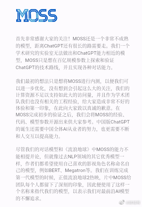 2月21日,MOSS官网发布公告称,MOSS还是一个非常不成熟的模型,距离ChatGPT还有很长的路需要走。我们一个学术研究的实验室无法做出和ChatGPT能力相近的模型,MOSS只是想在百亿规模参数上探索和验证ChatGPT的技术路线,并且实现各种对话能力。“我们最初的想法只是想将MOSS进行内测,以便我们可以进一步优化,没有想到会引起这么大的关注,我们的计算资源不足以支持如此大的访问量,并且作为学术团队我们也没有相关的工程经验,给大家造成非常不好的体验和第一印象,在此向大家致以真诚的歉意。”公告还解释名称源于《流浪地球》。据了解,在MOSS完成初步验证后,团队会将MOSS的经验、代码、模型参数开源供大家参考。