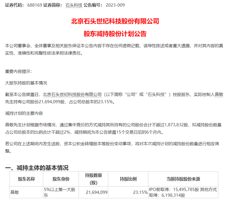2月21日晚间石头科技公告称,公司控股股东、实际控制人昌敬计划根据市场情况,通过集中竞价的方式减持其所持有的公司股份合计不超过187.38万股,拟减持股份数量占公司总股本的比例合计不超过2%,减持期间为本公告披露15个交易日后的6个月内。截至公告披露日,昌敬持有公司股份2169.4万股,占公司总股本的23.15%。按照石头科技最新股价360.12元/股计算,昌敬计划减持的股份市值约为6.75亿元。
