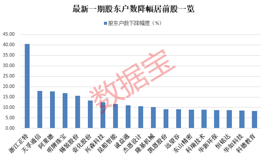 股东户数降幅最多的是浙江正特,截至2月20日最新股东户数为1.56万户,较2月10日下降40.54%,筹码集中以来该股累计下跌1.76%。其次是天孚通信,截至2月20日最新股东户数为1.71万户,较2月10日下降17.91%,筹码集中以来该股累计上涨1.18%。