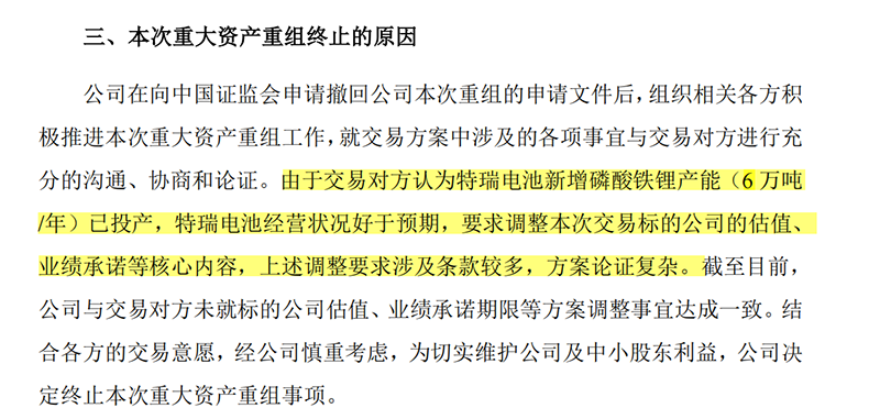 在最新公告中,万里股份表示,公司决定终止本次重大资产重组事项。“由于交易对方认为特瑞电池新增磷酸铁锂产能(6 万吨/年)已投产,特瑞电池经营状况好于预期,要求调整本次交易标的公司的估值、业绩承诺等核心内容,上述调整要求涉及条款较多,方案论证复杂。”