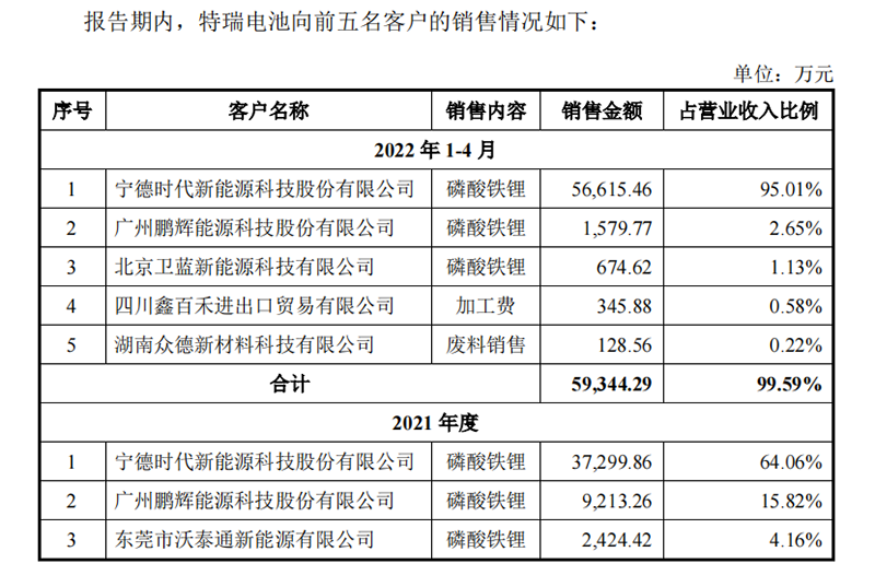 特瑞电池“坐地起价”自有原因,其已于2021年搭上“宁王”,成为宁德时代的供应商。2021年和2022年前4月,宁德时代为特瑞电池的第一大客户,收入占比分别达到64.06%、95.01%。