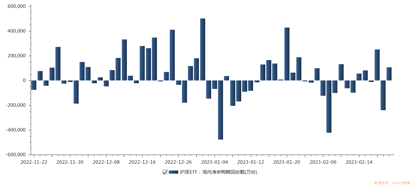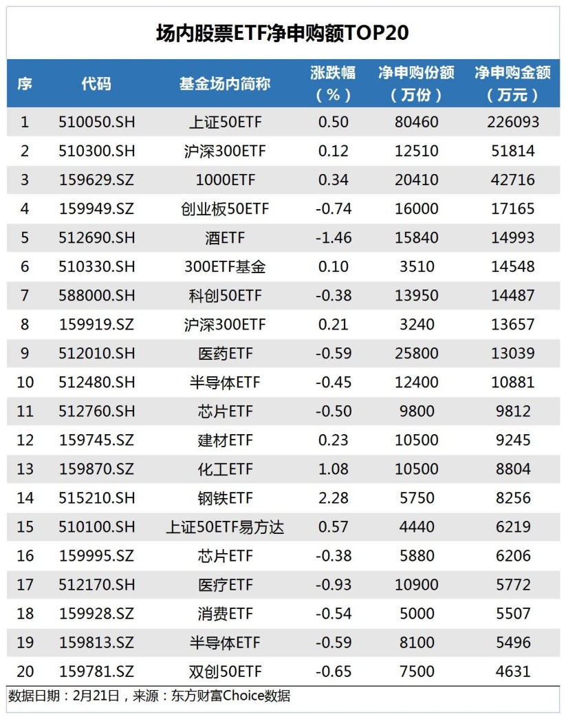 导读昨日(2月21日),两市成交额9214亿,较上个交易日缩量284亿。理财笔记Choice数据显示,昨日场内股票型ETF净申购10.69亿份,其中,沪市股票型ETF净申购11.21亿份,深市股票型ETF净赎回0.5