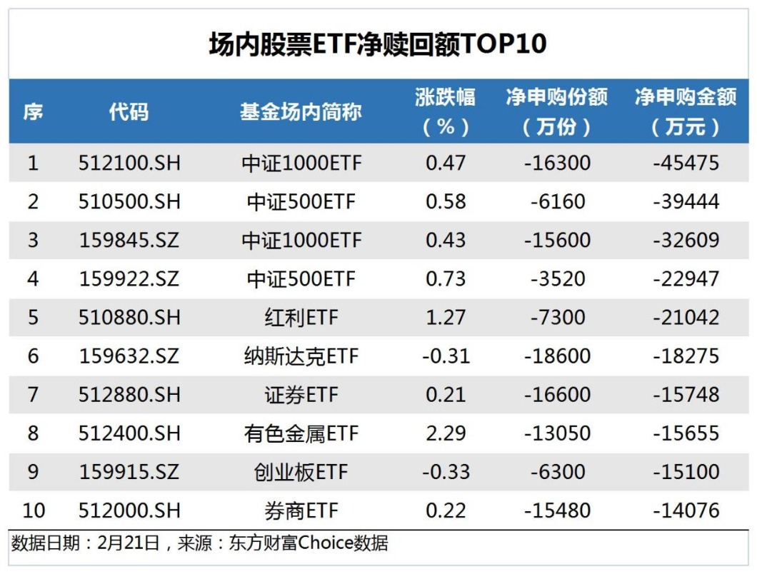 昨日(2月21日),两市成交额9214亿,较上个交易日缩量284亿。理财笔记Choice数据显示,昨日场内股票型ETF净申购10.69亿份,其中,沪市股票型ETF净申购11.21亿份,深市股票型ETF净赎回0.52亿份。以最新净值计,昨日市场净申购金额16.05亿元。