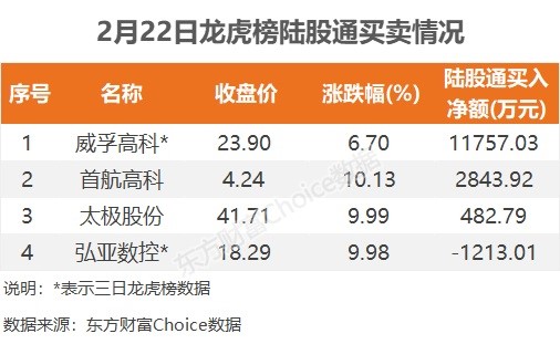 陆股通参与龙虎榜中个股共涉及4股,其中3股被陆股通净买入,威孚高科被净买入最多,三日净买入1.18亿元。而弘亚数控被陆股通三日净卖出1213.01万元。