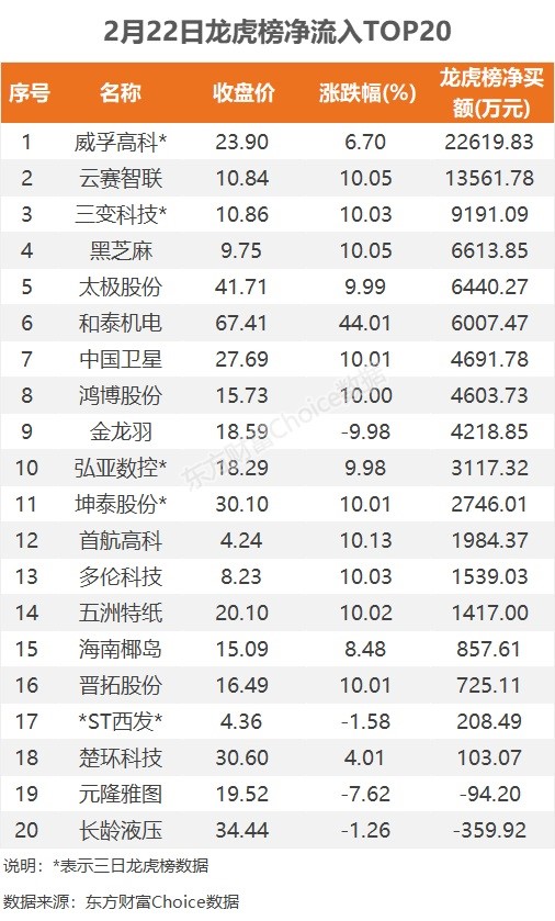 日内上榜龙虎榜个股中,资金净流入最多的是威孚高科,三日净买入2.3亿元。数据显示,该股日内大涨6.7%,近三日累涨29.12%。资金净流入居前的中金上海分公司三日净买入1.77亿元。