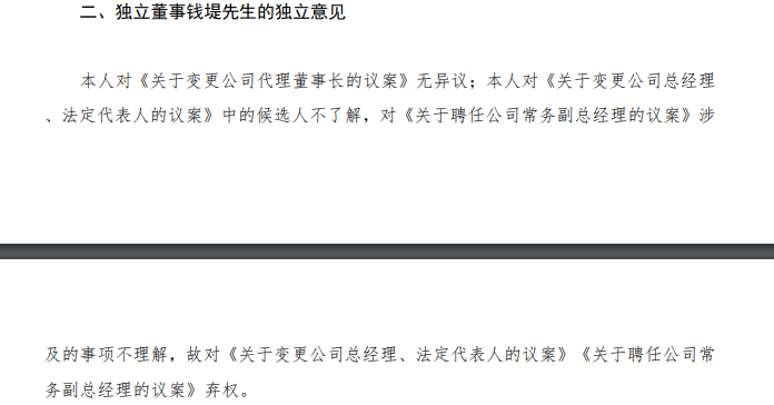 甚至,公司的独董都对这一人事任命表达了不理解。根据公司董事会决议,任命秦官成为公司总经理、法定代表人的议案出现了一票弃权。独立董事钱堤解释称,弃权理由是“对候选人缺乏了解”。