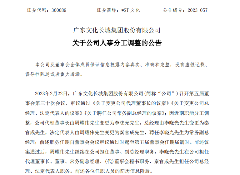 *ST文化2月22日晚间披露一系列人事分工调整,涉及代理董事长、总经理、常务副总经理等一系列核心职位。最惹人瞩目的是,公司推出了1995年出生的秦官成,他将接替李晓光成为公司总经理,接替周耀伟成为公司法定代表人。