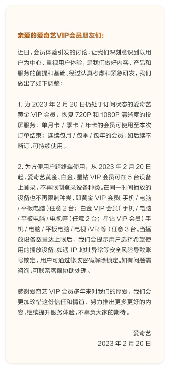 2月20日,针对会员投屏被限制清晰度和登录设备数量一事,爱奇艺称,爱奇艺黄金、白金、星钻VIP会员可在5台设备上登录,不再限制登录设备种类。对仍处于订阅状态的爱奇艺黄金VIP会员,恢复720P和1080P清晰度的投屏服务。