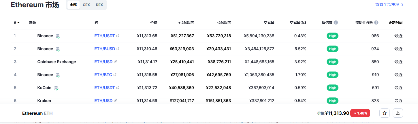 以太坊(ETH)各个交易所价格